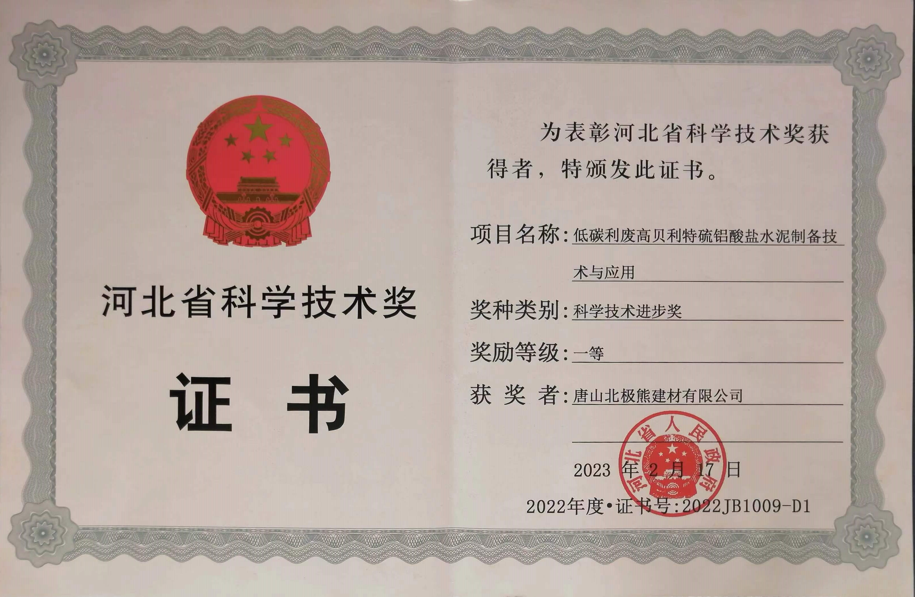 熱烈祝賀我公司低碳利廢高貝利特硫鋁酸鹽水泥制備技術與應用項目,獲得河北省科學技術進步一等獎!